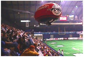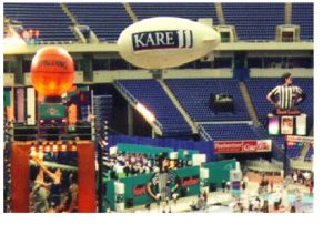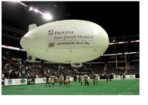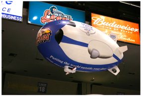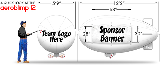 Aeroblimp 12 is our most popular model of remote controlled blimps, and suitable for smaller arena venues seating 2,500 and up. This size remote control blimp is a favorite for colleges, universities and mid-sized sporting events. If your venue is at 2,000 MSL or less, complete hull painting is available for team, sponsor or mascot logos. The Aeroblimp 12 comes standard with a selective drop device for dropping coupons, brochures, tickets and small premiums. Two digitally printed contoured banners are available.