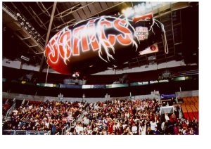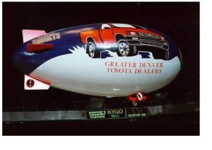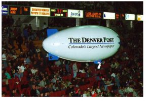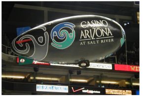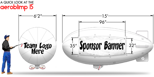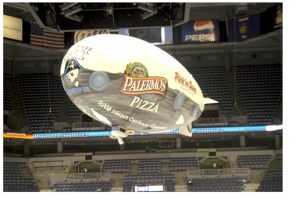 The Aeroblimp 15 is our most versatile Remote Control Nylon blimp is designed for medium to large arenas. This is the most popular model used in the NBA, NHL and Division I NCAA colleges. This size blimp permits slow speeds, pinpoint turns and graceful hovering — even in tight spaces. Complete hull painting is available for team, sponsor or mascot logos. The Aeroblimp 15 comes standard with a selective drop device for dropping coupons, brochures, tickets, small premiums and more. Depending upon elevation of your venue, the Aeroblimp 15 will support our broadcast quality camera system for direct links to indoor stadium screens, arena screens and network television systems. Two digitally printed contour banners are available.