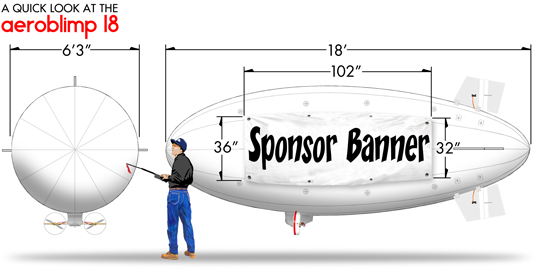 The 18′ Remote Control Nylon blimp is perfect for small sporting events outdoor concerts and fairs. This blimp can accommodate larger banners for increased visibility and larger payloads. The Aeroblimp 18 comes standard with a selective drop device for dropping coupons, brochures, tickets and small premiums. The RCO-18 can support our broadcast-quality video arena screen system with full pan and tilt features for direct links to indoor stadium screens and network television systems. Complete hull painting is available for team, sponsor or mascot logos. Two digitally printed contour banners are available.