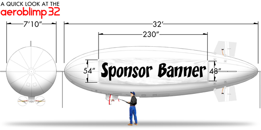 The Aeroblimp 32 Outdoor Remote Control Nylon Blimp is perfect for larger outdoor fields. This size of Remote Control Blimp can accommodate larger banners for increased visibility and larger payloads. This includes supporting our broadcast-quality video arena screen system with full pan and tilt features for direct links to outdoor stadium screens and network television systems.